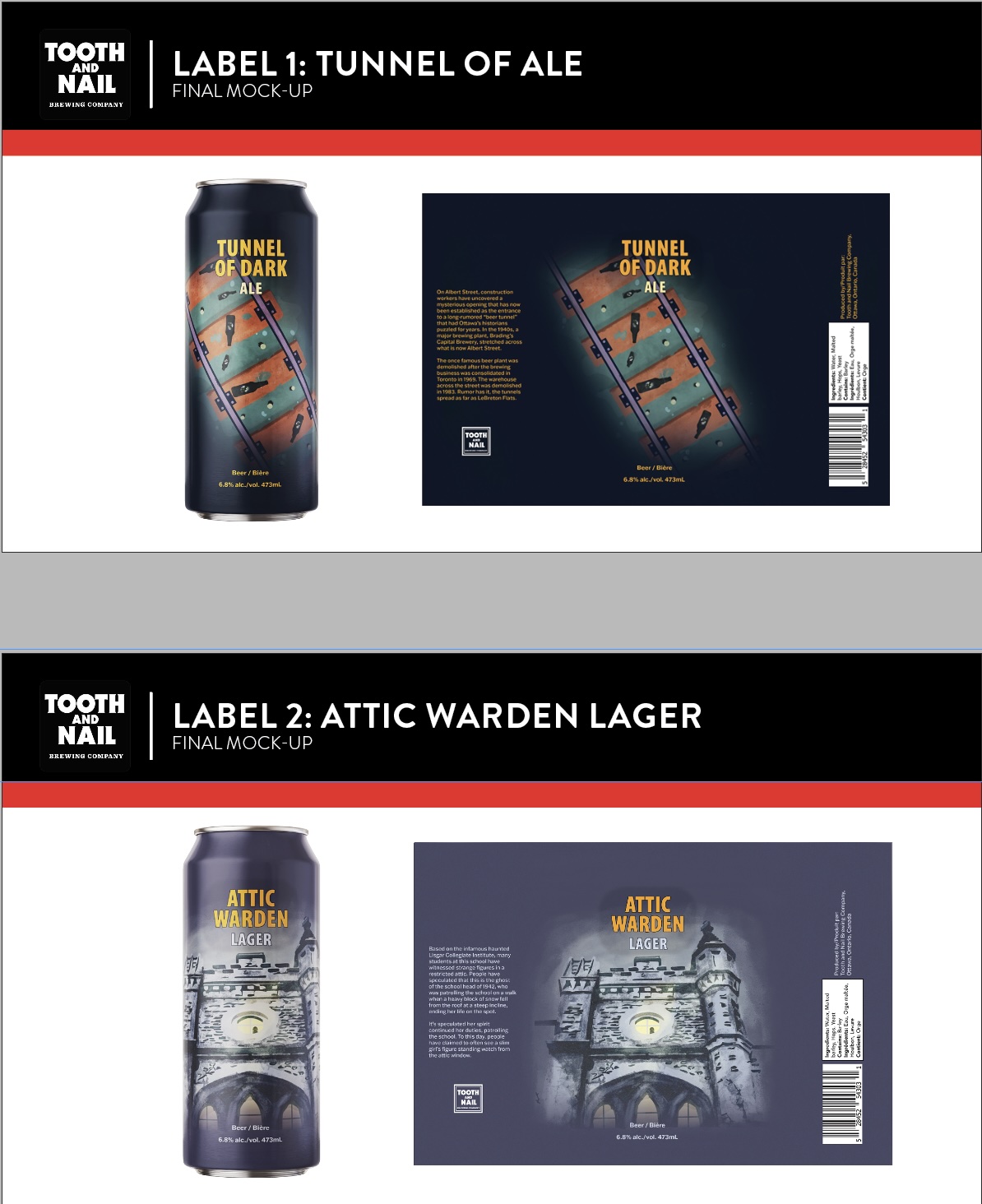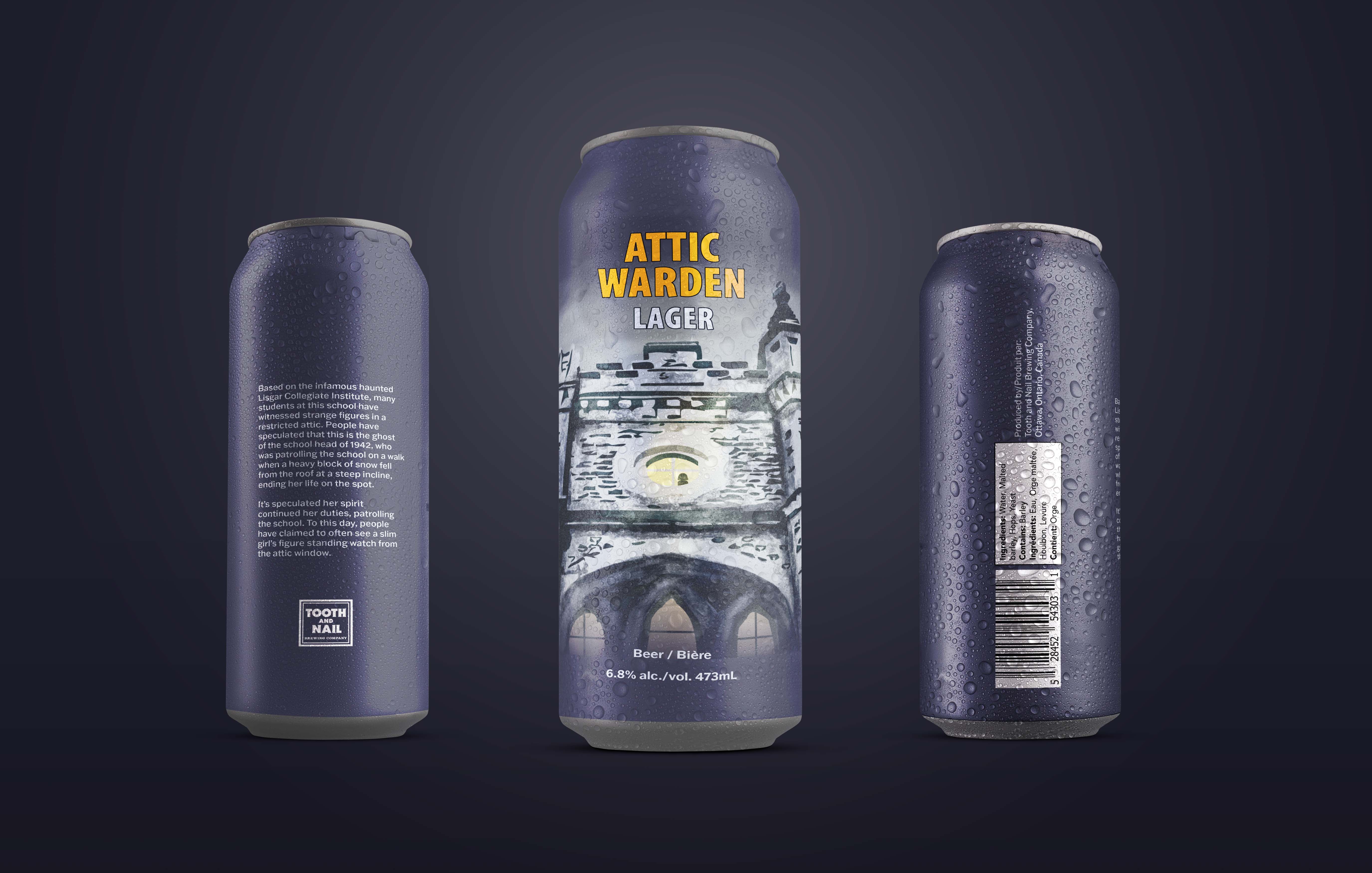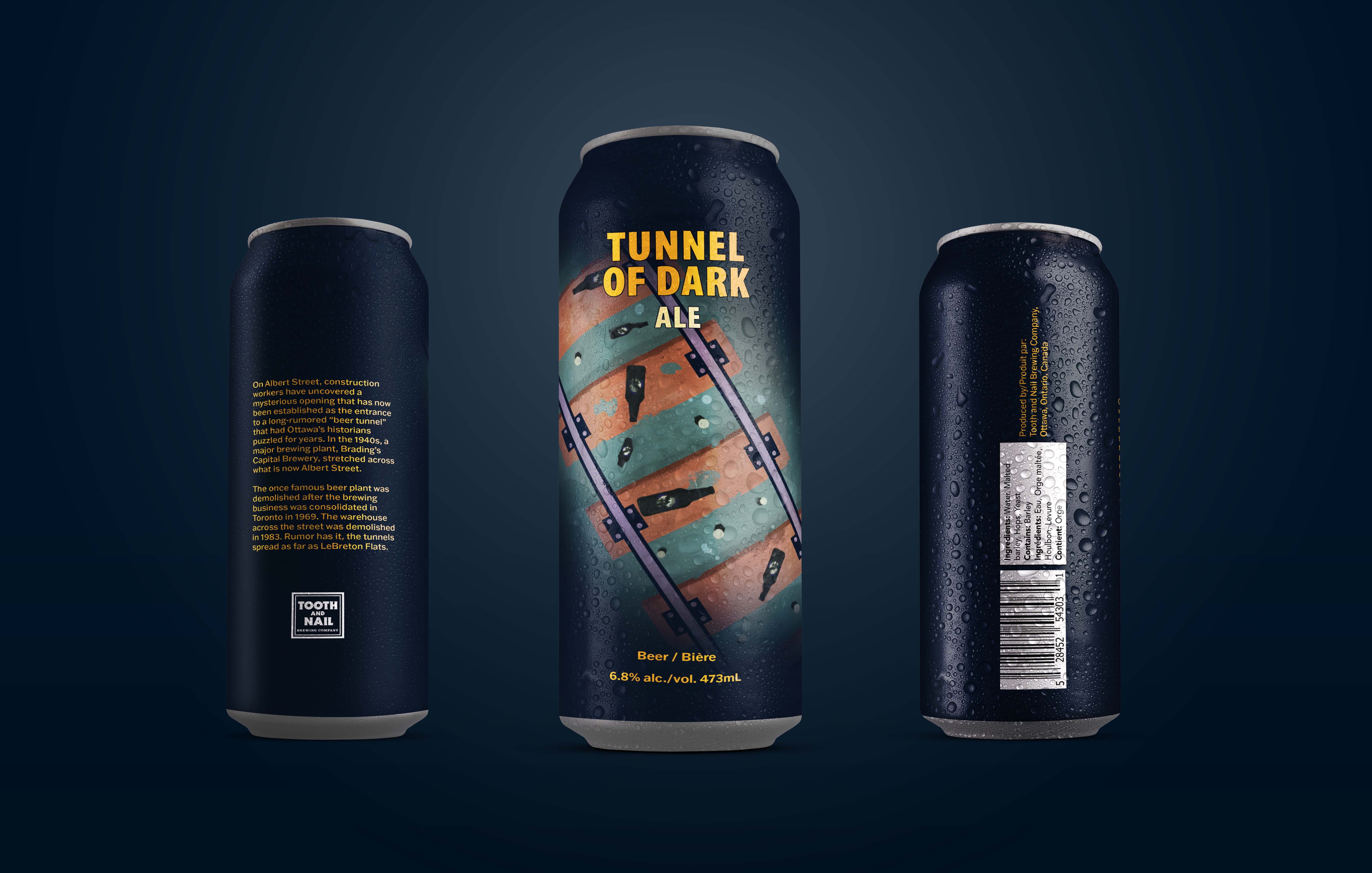 This concept project combined branding and packaging design for beer can designs developed for Tooth & Nail Brewing Company, a local brewery located in the heart of Hintongburg, tucked away in the neighbourhood of Wellington West in Ottawa. The Brewery takes pride in crafting quality beer, authenticity, and a place to foster a warm, welcoming community. Given the brewery has a focus on darker themes, I was inspired to capitalize on that and incorporate some of Ottawa's darker history into a design.